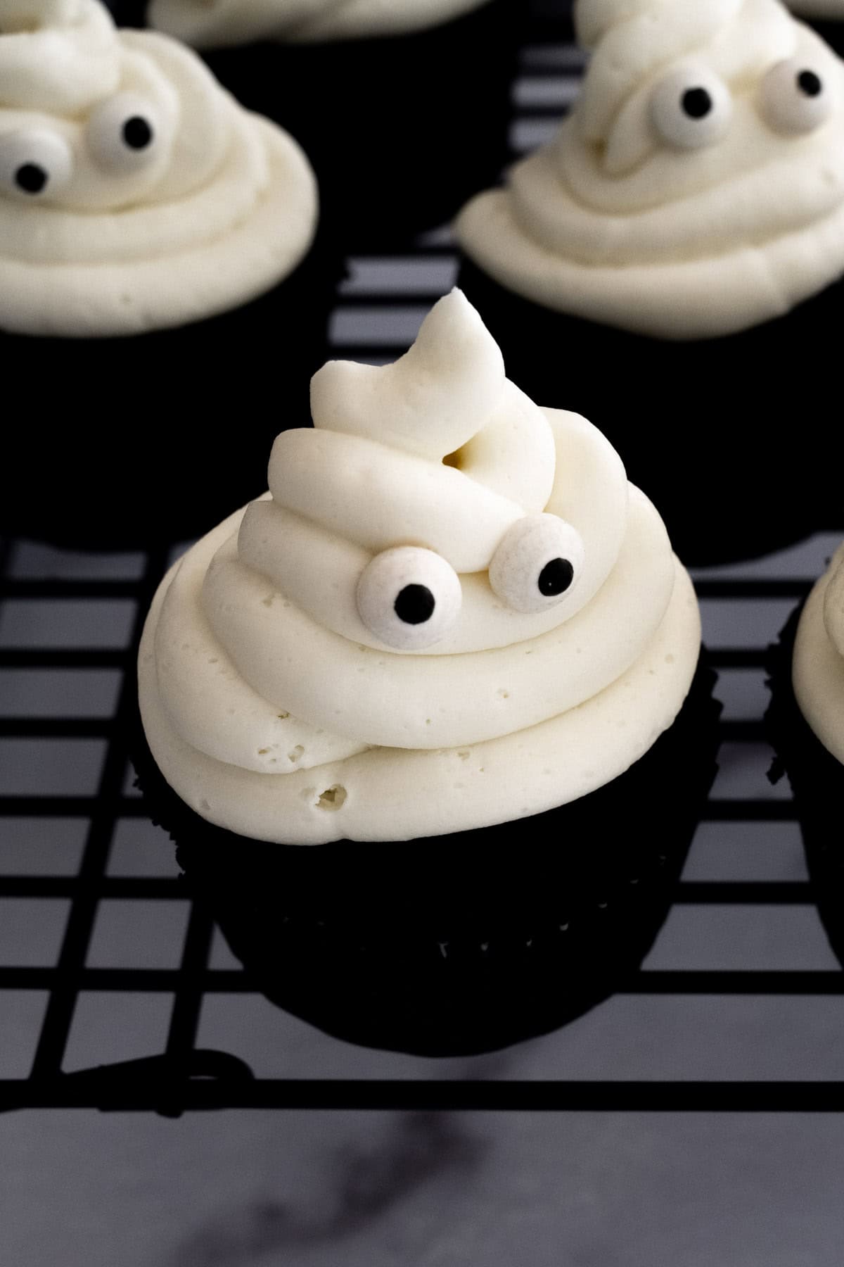- Place the frosting in a pastry bag or gallon-sized freezer bag and cut the end off. Pipe the frosting onto the cooled cupcakes, making concentric circles for the ghost. Add eyes and voila!