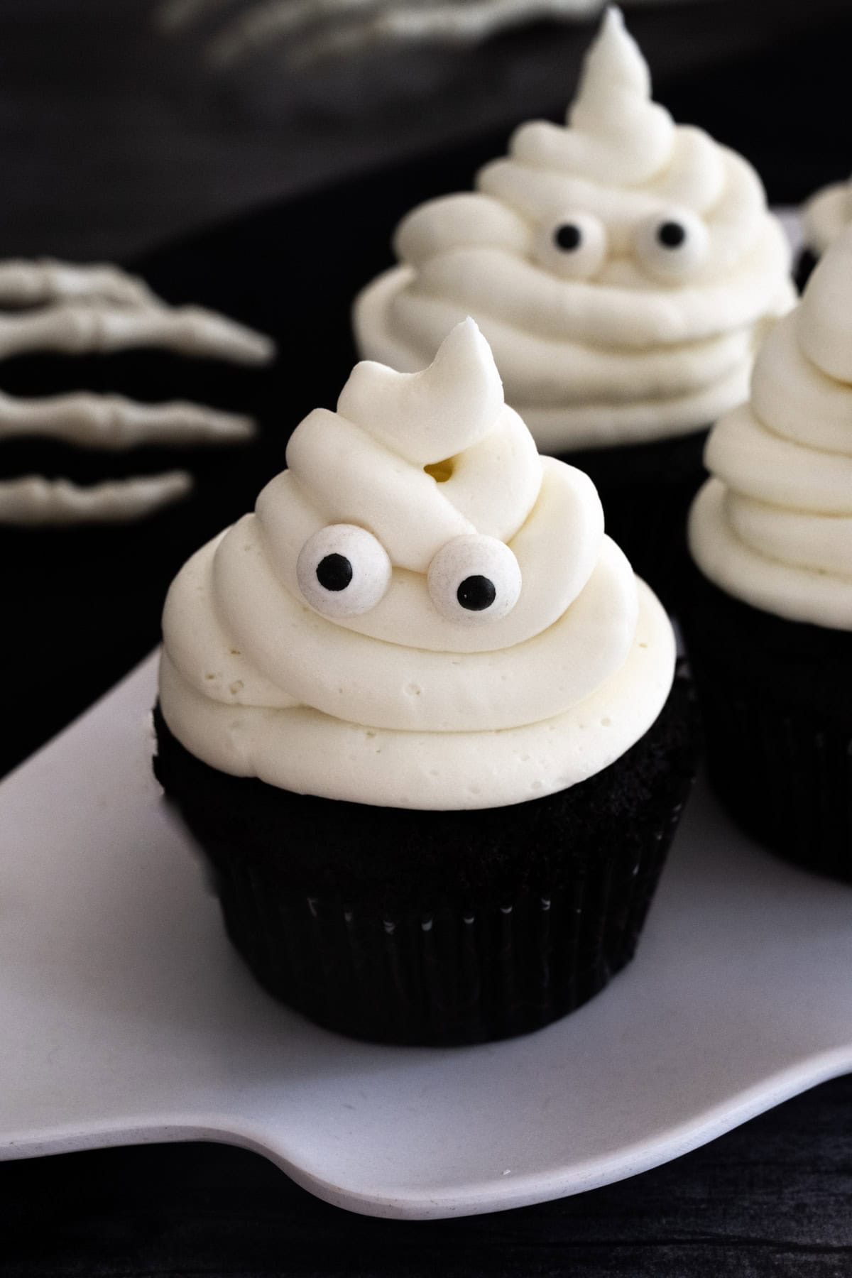 These black cocoa cupcakes are made with my absolute favorite chocolate cake recipe. Friends who don't even love chocolate rave about this recipe. Then I top the cupcakes off with a classic vanilla frosting using clear vanilla extract to get that as-close-to-white look as possible for the ghosts.